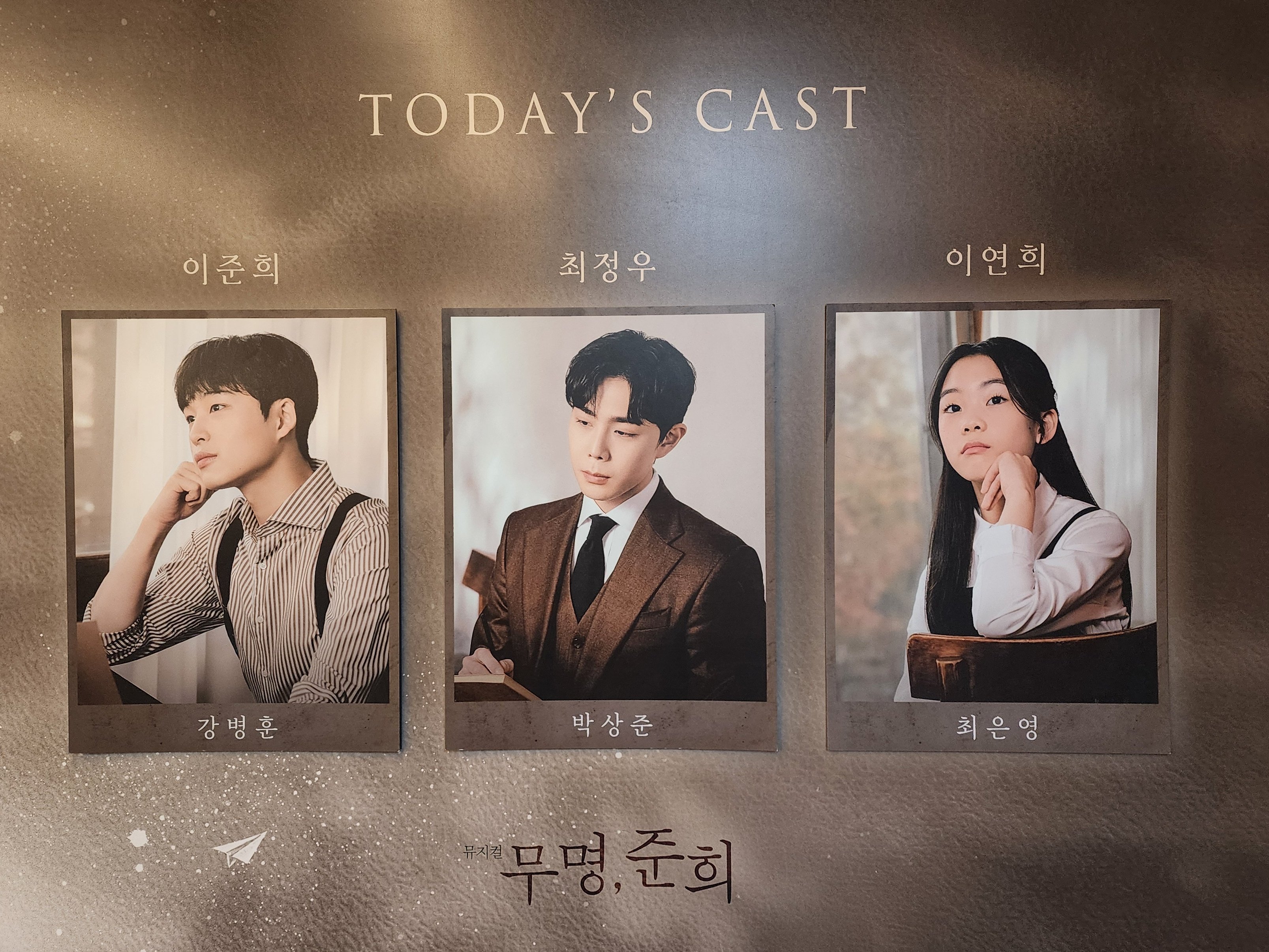 물론 다른 캐스트들도 다 잘하고 서로를 보는 눈 너무 예쁘니 이들만이 예쁘다는 거 절대 아님. 그냥 오늘 보는데 서로가 서로를 보는 눈에 가득 담긴 애정이 너무 예뻐서 극 안의 그들이 무대 위에서 반짝이며 서로를 아껴서 커튼콜에 셋이 끌어안는 모든 순간까지 다 따스함이 유난히 내게 좋았다ㅠ