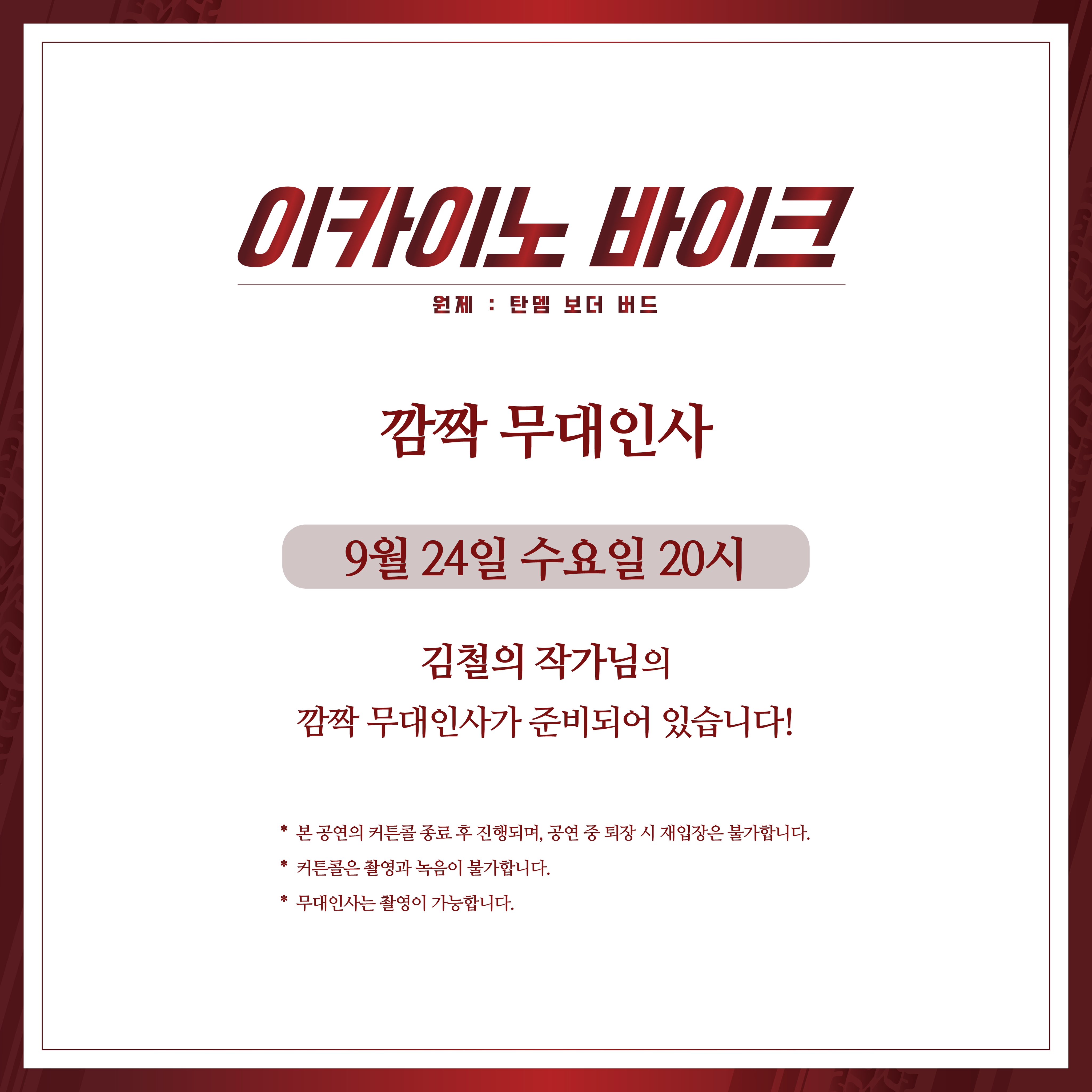 갑자기 이벤트가 닥쳐온 날이었는데! 커튼콜이 끝난 뒤 이어진 바로 이 작가님의 무대인사가 참 좋았다. 아마도 오사카에서라고 하신 거 같은데 단편 연극제에서 작품이 수상을 하고 오세혁 연출에 의해 불의 전차와 연을 맺게 되었는데, 이제 불의 전차에서 네번이나 공연을 했고, 작품이 자신의 품을 건강하게 떠난 자식같았다고 공연을 본 소감을 전하셨는데, 그 목소리에 행복함과 뿌듯함이 정말 가득 담겨계셨다. 일본에서 쓰여진 이 작품이 한국에서 생명력을 갖고 공연되어지는 그 모습 자체가 이 극이 말하고 싶어한 폭력이 이어지지 않는, 경계가 무의미해지는 순간이라고 느끼셨을까 싶었어.