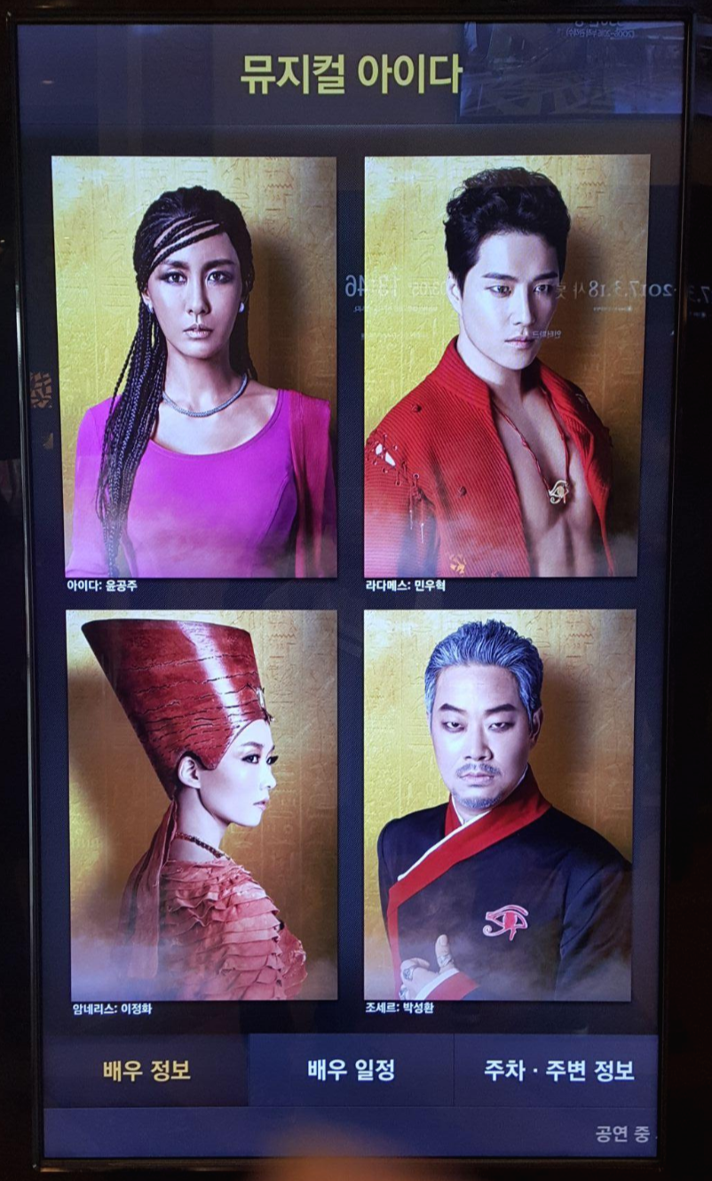 아이다는 오페라 아이다를 학교 음악 시간에 비디오로 틀어줬을 때 보면서 줄거리 극혐.이라고 생각했다. 아이다의 솔로 넘버인 댄스 오브 로브라는 넘버와 암네리스 넘버 my strongest suit를 들어본 본 적이 있다. 정도가 뮤지컬 아이다 관극 전 제 배경 지식의 전부인데.... 배경지식과 아이다에 대한 꾸준한 비호감 고백을 가지고 각오했던 것보다 아이다와 라다메스가 너무 극혐이라 좀 충격적이었던 관극이었어다. 뮤지컬이 오페라랑 줄거리가 아주 아주 큰 줄기는 비슷해도 디테일이 다른데 다른 디테일 하나하나가 격렬하게 혐오스러워서 남녀 주인공 튀어나올 때마다 괴로운 건 슬프더라. 배우들 노래도 연기도 넘버 자체도 맘에 들어서 더 슬픈ㅠㅠ 이렇게 노래도 잘하고 훈훈한 배우들이 저렇게 열심히 귀에 괜찮은 멜로디를 부르는데 넘버 가사가 극혐이니 미치겠네^0^ 상태였달까. 여튼 상상을 뛰어넘는 혐캐들이었다. 심지어 뮤지컬 시작이 현대에서 다시 만나는 거였을 줄이야. 오페라 줄거리로 기억하는 수준으로도 재수없는 애들인데 쟤네 만나면서 시작해? 진짜 싫다하고 짜식으면서 시작했는데 다행히 장면 전환 되고 보이는 무대세트 색감이 예뻐서 집중이 바로 되었으니 다행이었다. 그래봤자 아이다랑 라다메스 싫은 이유 줄줄이 풀 거지만ㅋㅋㅋㅋ
