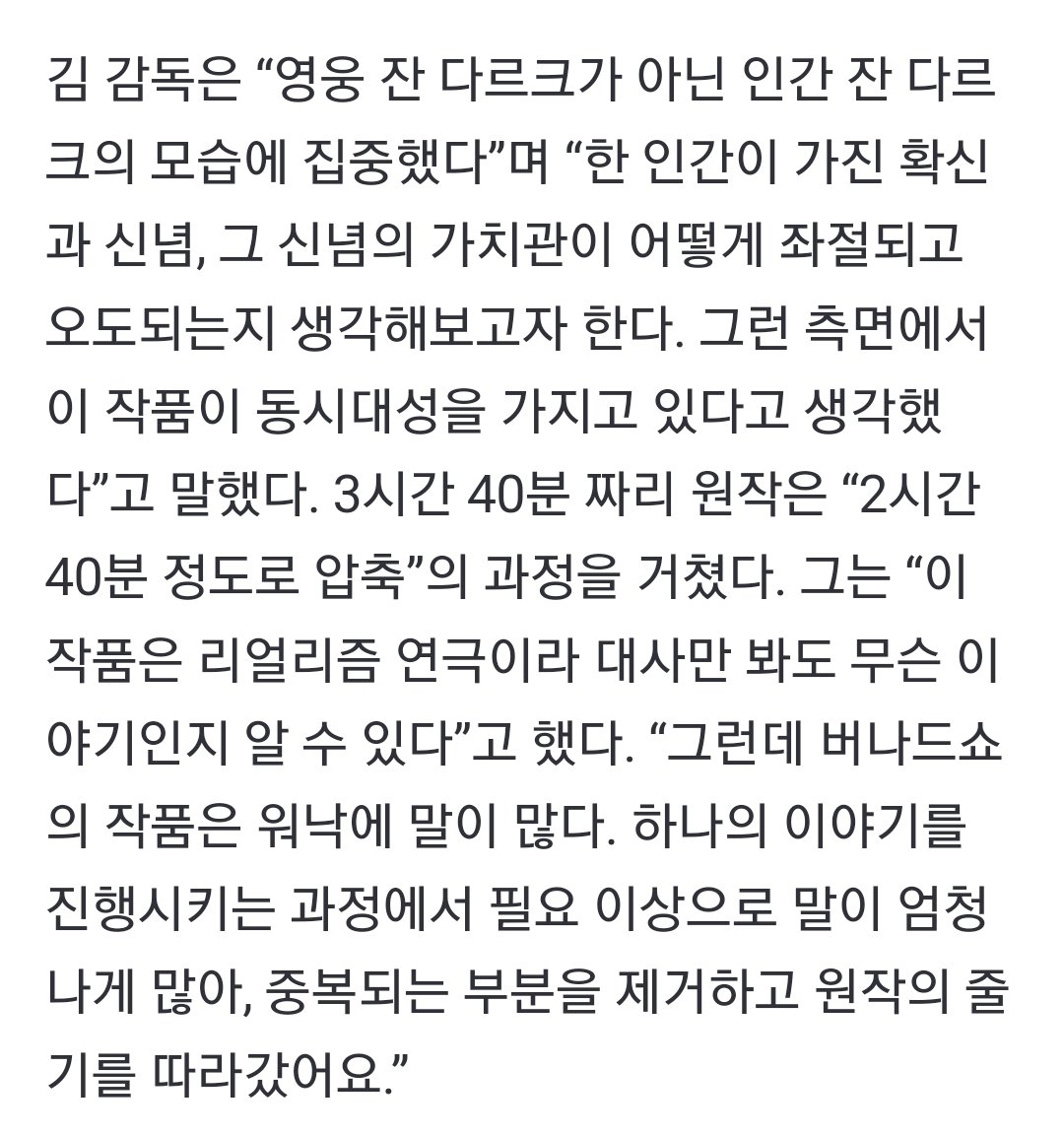 1막 마지막, 두 줄의 조명으로 표현된 기울어진 십자가와 꼿꼿이 서있는 조앤의 대비 같은 건 진짜 배우의 힘과 단순함이 주는 깊이를 모두 잘 아는 이라서 만들 수 있는 장면이었다고 생각한다.